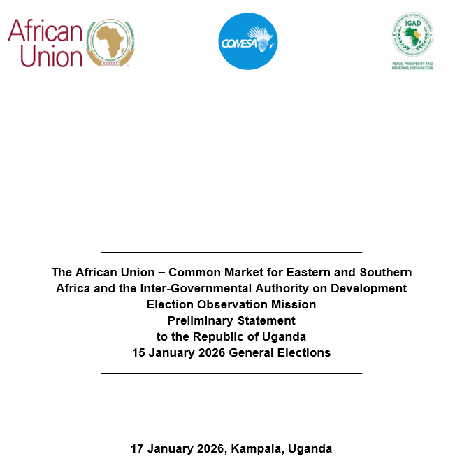On 15 January 2026, the Republic of Uganda held General Elections to elect the President and Members of Parliament. In line with its mandate to promote democracy, peace, and good governance among its Member States, and following an invitation from the Government of the Republic of Uganda, the African Union (AU), in collaboration with the Common Market for Eastern and Southern Africa (COMESA) and Intergovernmental Authority on Development (IGAD) deployed an election observation Mission from 7 to 19 January 2026. Prior to the deployment of the Mission, the AU and COMESA undertook Pre-Election Assessment Mission (PAM) from 17 to 21 November 2025.
